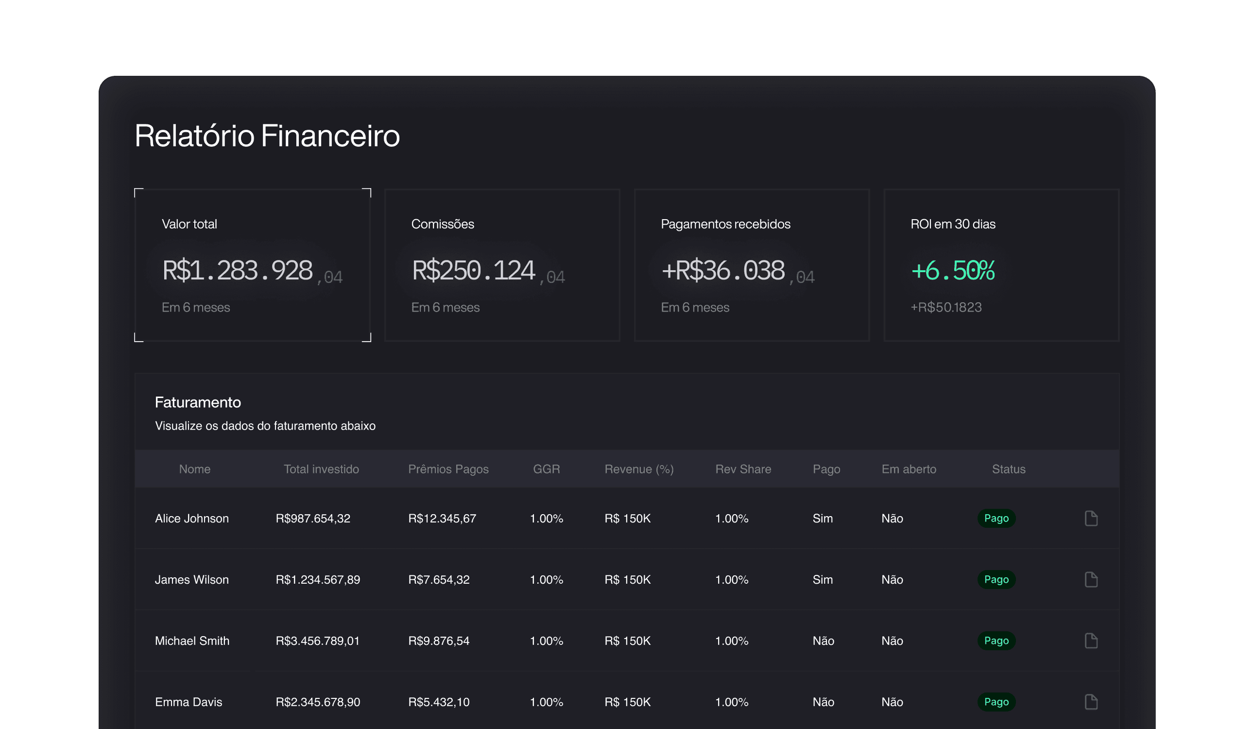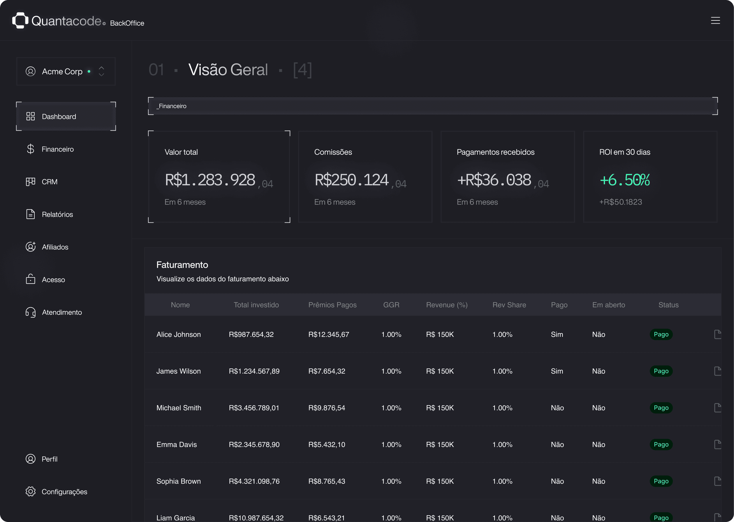 Um ecossistema completo que integra CRM, compliance, afiliados, relatórios, marketing e gestão de usuários .